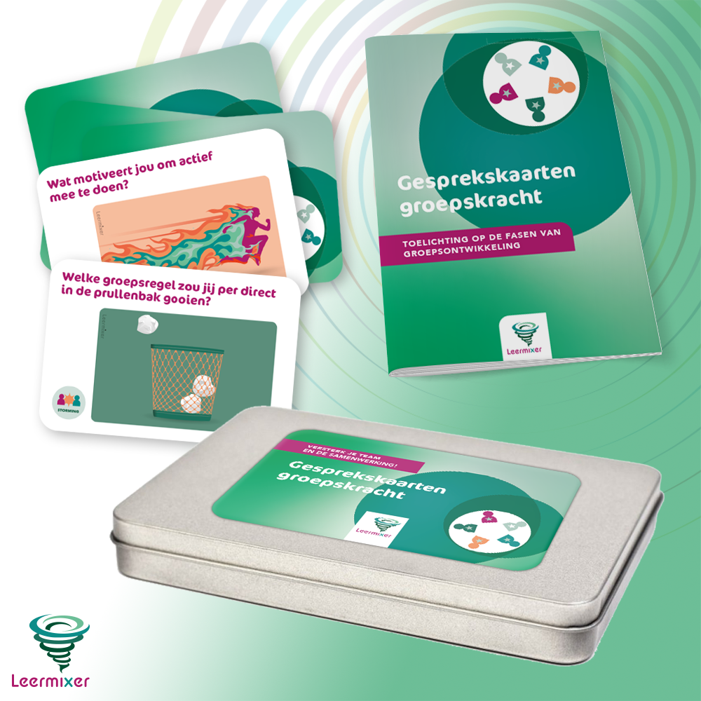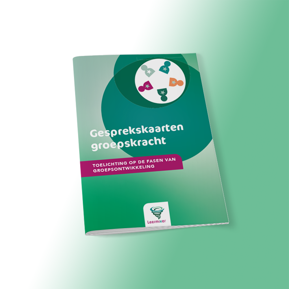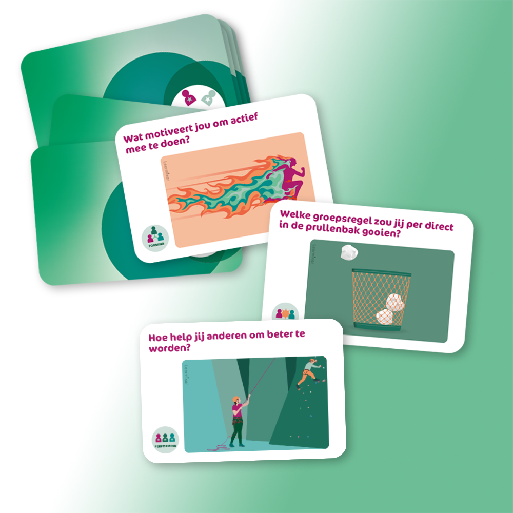 Het model van Tuckman beschrijft de ontwikkeling in fasen. Zet deze set gesprekskaarten in om een groep of team te ondersteunen in elke fase van het groepsvormingsproces: Forming (vorming), Storming (‘stormen’), Norming (normeren), Performing (presteren) en Adjourning (afronden).